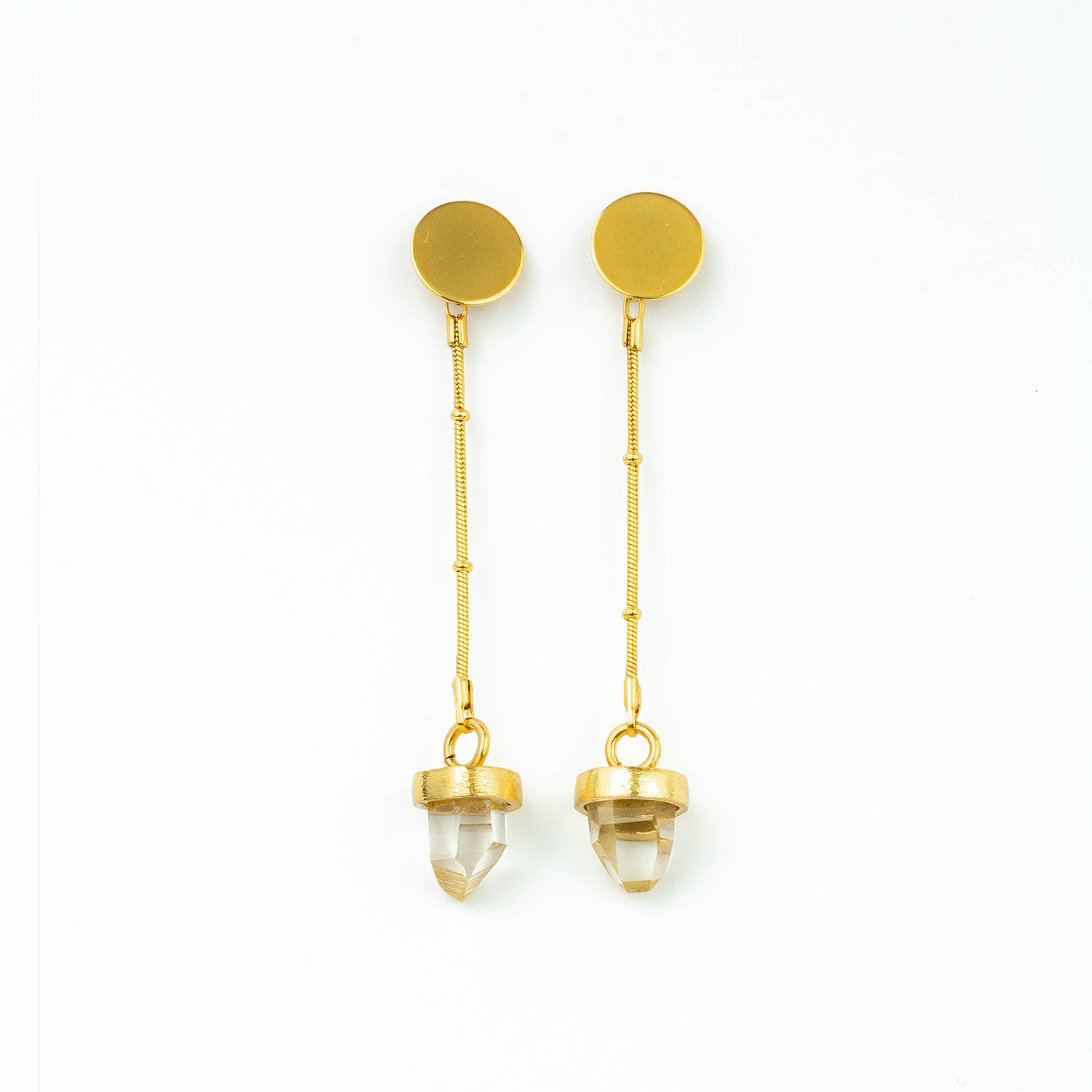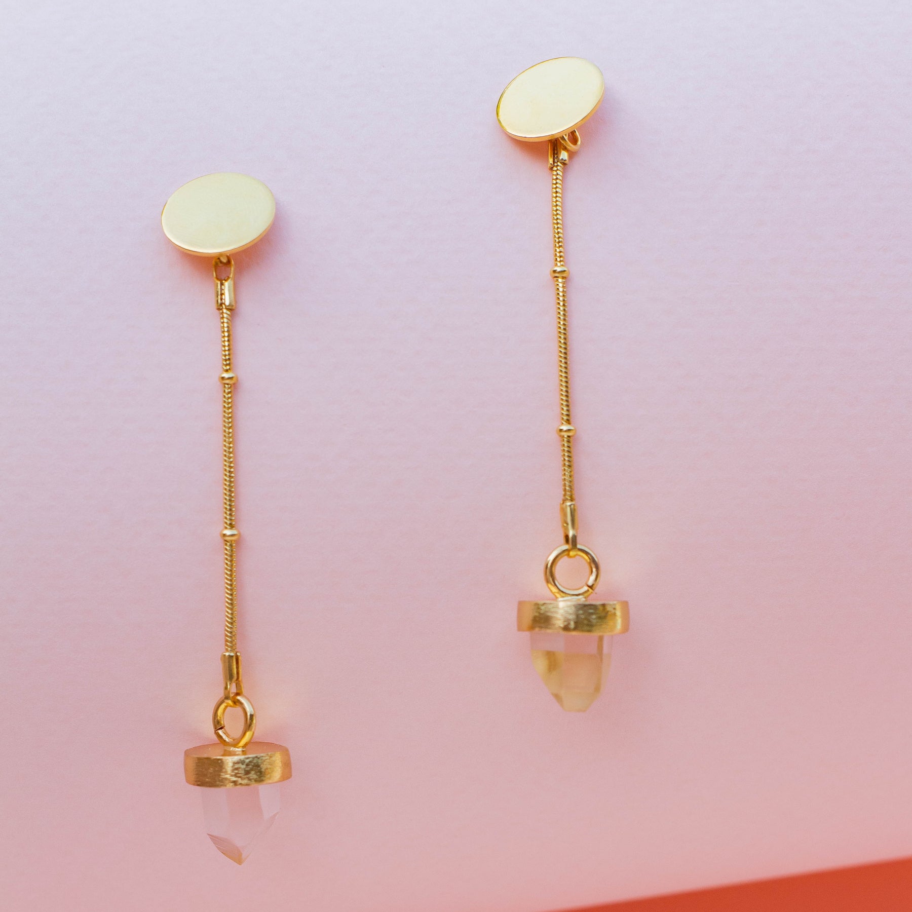Aretes de punta natural de Cuarzo Cristal hecho a mano con baño de oro de 24k .